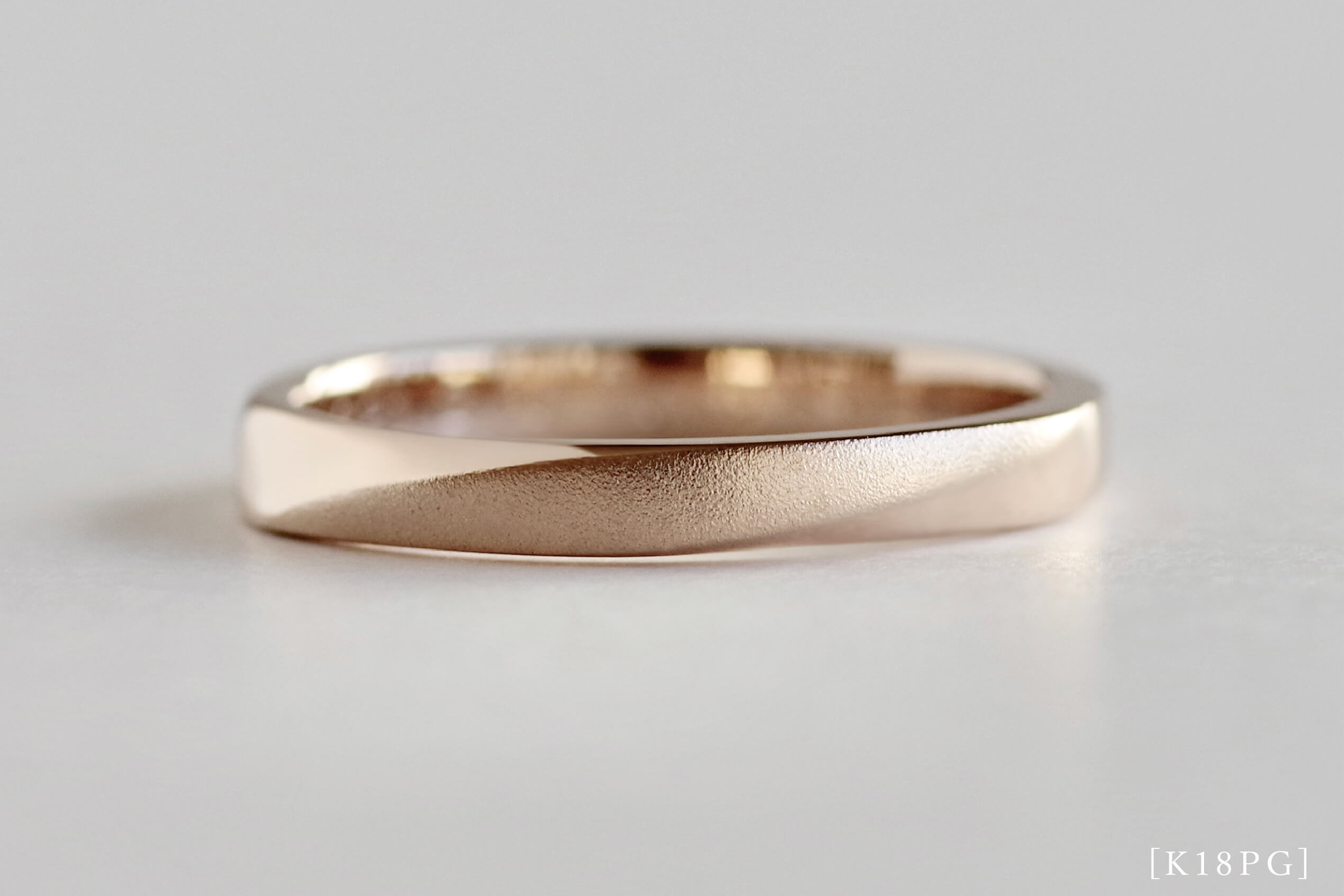 平打ちリングを手作業で 斜めに削り出すことで生まれるひねりのライン。 角を出し表面に境目を作ることで ダイヤモンドを留めたり、 中央とサイドの表面加工を変えたり、 様々なアレンジの幅が広がるデザインです。 さりげない飾り気とつけ心地の良さで、 お客様に非常に人気の高い1本です。